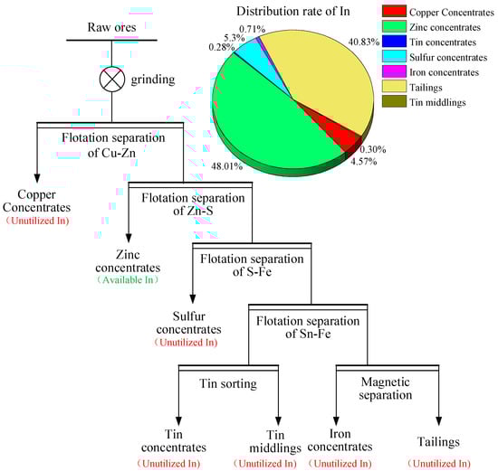 In the Dulong mineral processing plant, indium, as an important by-product of zinc concentrate, has considerable economic value [11,39]. However, because the ore is a complex polymetallic deposit, the recovery rate of indium in the beneficiation process is low, and the recovery methods are single. Above, we have clarified the enrichment characteristics and substitution mechanisms of indium, but important indicators, such as the yield, grade, and recovery rate of the beneficiation products, remain unclear. Hence, the beneficiation process of the Dulong beneficiation plant must be investigated.
