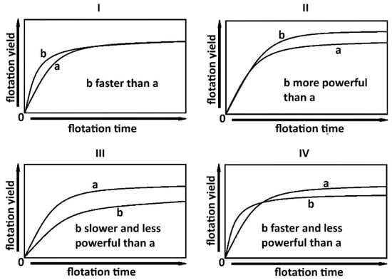 An overview of flotation with different kinetics (faster or slower) and thermodynamics (more or less powerful), (I)—faster flotation, (II)—more powerful flotation, (III)—slower and less powerful flotation, (IV)—faster and less powerful flotation [7].