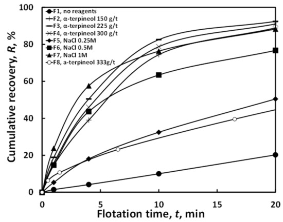 The flotation kinetics of copper-bearing shale in water and in the presence of NaCl and α-terpineol. F8—data from [36].