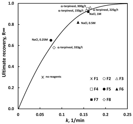 Figure 4 shows the flotation results for copper shale, illustrating the relationship between ultimate recovery (R∞) and the first-order flotation rate constant (k).