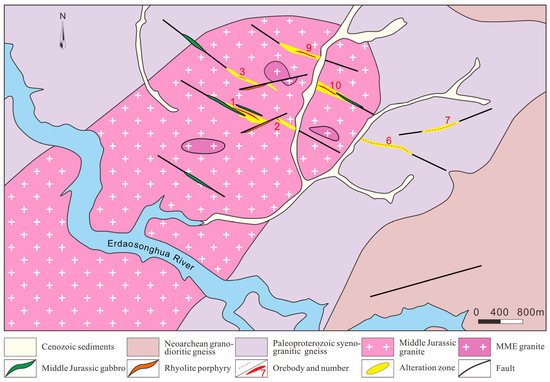 The Naizhigou gold deposit (1.3 t Au and 11.7 t Ag), located in the southeastern part of the Huiquanzhan Fault, was discovered by Team 608 of the Jilin Nonferrous Geological Bureau in 1996 [24]. It is featured by quartz vein-type ores with minor disseminated-type ores. Orebodies at Naizhigou are mainly hosted in the Middle Jurassic Naizhigou pluton, with minor orebodies in the Paleoproterozoic syenogranitic gneiss (Figure 2). The Naizhigou pluton (ca. 177 Ma) [17] comprises granite and mafic microgranular enclave-bearing (MME) granite and has been crosscut by the gabbro and rhyolite porphyry (Figure 2). Moreover, the MME granite contains various alterations (i.e., quartz, K-feldspar, and epidote; Figure 3A,B), disseminated sulfide (i.e., pyrite and molybdenite; Figure 3A,B), and irregular MMEs (Figure 3B). The NW-trending faults are main ore-controlling faults, as they control the distribution of most orebodies (i.e., No. 1–3 and 9–10 orebodies) and syn-ore gabbro dikes, whereas the NE-trending faults generally crosscut the No. 1 and 3 orebodies and host the rhyolite porphyry and No. 6–7 orebodies (Figure 2 and Figure 3C).