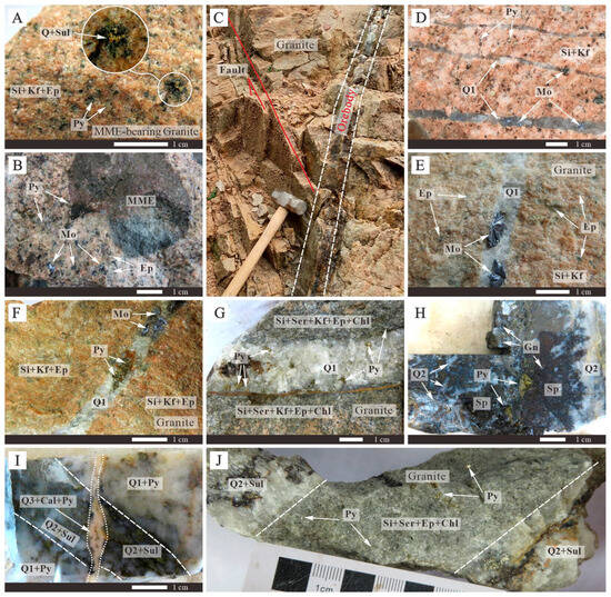 Representative photographs of the major geological units, orebody, ores, minerals, and alteration of the Naizhigou gold deposit. (A) MME granite contains various alterations and sulfide aggregates. (B) The MME contains various mafic microgranular enclaves and disseminated molybdenite and pyrite. (C) Near-vertical orebody. (D) Three parallel early-stage quartz veins. (E,F) The early-stage molybdenite–pyrite-bearing quartz veins and proximal hydrothermal alteration. (G) Early-stage pyrite-bearing quartz veins and massive hydrothermal alteration. (H) Main-stage sulfide quartz vein. (I) Early- and main-stage minerals crosscut by a quartz–calcite vein. (J) The monzogranite between the two parallel main-stage sulfide quartz veins contains various hydrothermal alterations, producing pyrite, quartz, sericite, chlorite, and epidote. Abbreviations: Chl—chlorite; Ep—epidote; Kf—K-feldspar; MME—mafic microgranular enclave; Mo—molybdenite; Py—pyrite; Q1—early-stage quartz; Q2—main-stage quartz; Q3—late-stage quartz; Ser—sericite; Si—silicification; and Sul—sulfide.