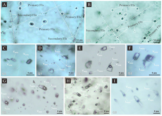 Petrographic characteristics of FIs hosted in quartz grains of different stages from the Naizhigou deposit. (A,B) Primary and secondary FIs in early- and main-stage quartz; (C) PC-type FIs coexist with W-type FIs in early-stage quartz; (D) W-type FIs hosted in early-stage quartz; (E) C-type FIs coexist with W-type FIs in early-stage quartz; (F–H) C-type FIs coexist with W-type FIs in main-stage quartz; and (I) W-type FIs hosted in late-stage quartz. Abbreviations: FIs—fluid inclusions; VCO2—vapor CO2; LCO2—liquid CO2; VH2O—vapor H2O; and LH2O—liquid H2O. Others are the same as those in Figure 3.