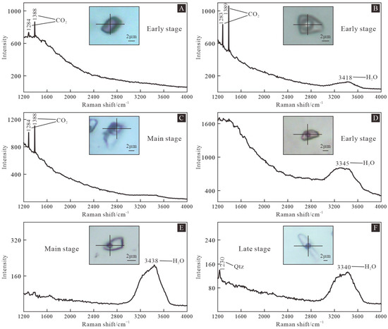 Three FI types were identified based on their compositions and phase transition; they are PC- (pure CO2), C- (CO2–H2O–NaCl), and W-type (H2O–NaCl) FIs [4,30]. Representative FI components of the FIs are shown in Figure 7. The vapor phase contents for PC- and C-type FIs from the early- to main-ore stages are mainly CO2 with minor amounts of H2O (Figure 7A,B,D). H2O is the main component for W-type FIs from the three stages (Figure 7C–F). The orefluids gradually evolved from a CO2–H2O–NaCl system in the early-ore stage to a H2O–NaCl system in the late-ore stage (Figure 7).