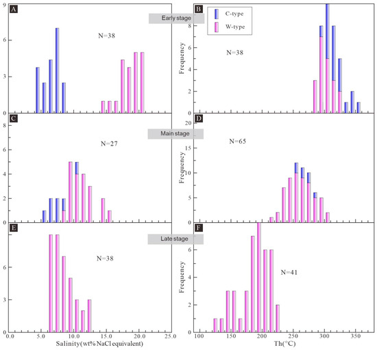 Histograms of salinity (A,C,E) and total homogenization temperature (Th) (B,D,F) for C- and W-type FIs in different stages from the Naizhigou deposit.