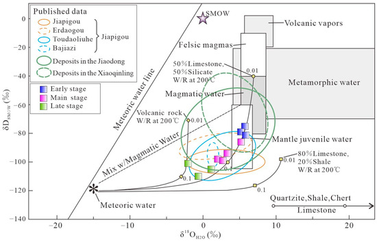 δ18O–δD plots of ore fluids from the Naizhigou deposit [31,32]. The Mantle juvenile water field was revised according to [33]. The published data of the Jiapigou and Jiaodong districts are from [5,11,13,31,34,35,36,37,38]. Abbreviations: SMOW—Standard Mean Ocean Water.