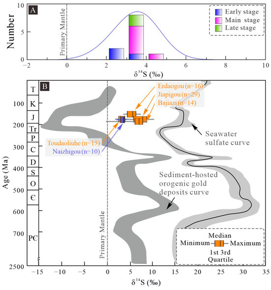 Histogram of the S isotopic compositions of pyrite from the Naizhigou (A) deposit and box–whisker plots of δ34S values for the gold deposits in the Jiapigou district (B) showing the variations in the sulfur isotopic compositions of sulfides of global sediment-hosted orogenic gold deposits and marine sulfate curves through geologic time [39,40]. The published data sources of the gold deposits in the Jiapigou district are the same as those in Figure 9.