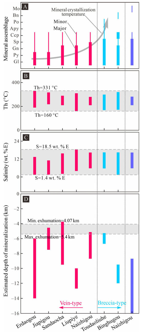 Comparison of the mineral assemblage (A), homogenization temperature (B), salinity (C), and estimated depth of mineralization (D) for the deposits in the Jiapigou district. The published data of the gold deposits in the Jiapigou district are from [5,15] and references therein.