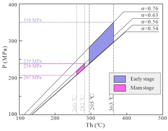 The estimated trapping pressure–temperature conditions for the early and main stages in the Naizhigou deposit. The isochores were calculated based on the H2O–CO2–NaCl system using the Flincor software [28].