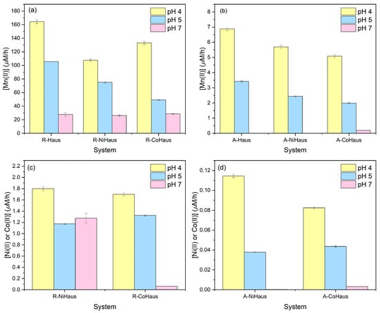 The [Mn(II)]aq release rates for pristine and Ni (or Co)-substituted hausmannite minerals were compared for different equilibration periods and solution pHs (Figure 1a,b). All R systems produced significantly higher release rates than the A systems, indicating that mineral dissolution rates decreased with increasing equilibration period. Among the R systems, the highest release rates were found at pH 4 (yellow in Figure 1a), followed by pH 5 (blue), and the lowest rate was recorded at pH 7 (pink). This finding is consistent with other studies [7,34,44], where low solution pH accelerated mineral dissolution, and the Mn2+ ion release rate from the hausmannite structure increased with decreasing pH. At lower pHs, where mineral dissolution was favored, pristine hausmannite (R-Haus) released much more [Mn(II)]aq than metal-substituted hausmannite minerals, implying that the presence of structural impurities affects the mineral dissolution rates. By comparison, when mineral dissolution was suppressed by higher pH (e.g., pH 7, pink), all R minerals presented a similar dissolution rate, indicating little to no effect of structural impurities on mineral dissolution. While much lower Mn release rates were observed in the A systems (Figure 1b), the highest rates were found at pH 4 (yellow), followed by pH 5 (blue), similar to the R systems. However, no measurable Mn release was observed at pH 7. Similar to the R systems, pristine hausmannite exhibited a higher Mn release rate than the metal-substituted phases, although the extent was not as substantial as in the R systems.