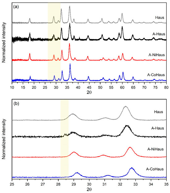 PXRD analysis on aged hausmannite minerals at pH 5. (a) Diffractograms of A-Haus (black), A-NiHaus (red), and A-CoHaus (blue) with a reference of hausmannite (gray) and (b) enlarged diffractograms in 2θ range from 25° to 35° (orange box) for better presentation of peaks that appeared after 30 days of equilibration.