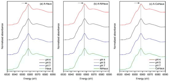 Mn K-edge XANES regions for (a) A-Haus, (b) A-NiHaus, and (c) A-CoHaus from pH 4 (red), pH 5 (black), and pH 7 (blue). Freshly synthesized, (a) pristine, (b) Ni-substituted, and (c) Co-substituted hausmannite minerals were used as a reference (green) for comparison. The black solid line guides the shift in the location of the absorption edge towards higher energy.