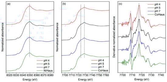XANES regions of (a) Ni K-edge, (b) Co K-edge, and (c) Co K-edge in first derivative from freshly synthesized metal-substituted hausmannite minerals (Haus (green)) and A-NiHaus or A-CoHaus equilibrated for 30 days at pH 4 (red), 5 (black), and 7 (blue). The dashed lines indicate that no change was observed at the absorption edge location after aging.