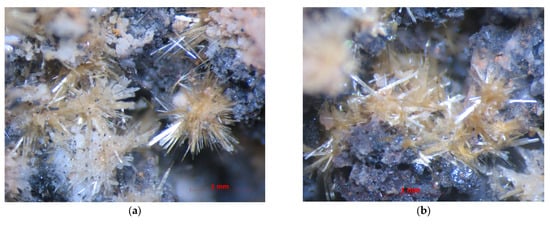 In the type material, achyrophanite occurs as long-prismatic (lath-, sword-, or spear-like) to acicular crystals elongated along [100] and usually flattened on [001], up to 0.02 × 0.2 × 1.5 mm, which form parallel, radiating, bush-like, or chaotic aggregates up to 3 mm across (Figure 1a–d and Figure 2). Rarely, they are combined in interrupted, open-work encrustations on the surface of basalt scoria altered by fumarolic gas. In the specimens collected in 2018, achyrophanite crystals (up to 0.5 mm) demonstrate another morphology: they are flattened prismatic to tabular (Figure 1e,f). The pinacoid {001} is the major form of achyrophanite crystals; lateral faces are typically represented by the pinacoid {010}; on some crystals the pinacoidal face {100} and/or non-indexed faces of the prismatic zone {hk0} are observed.