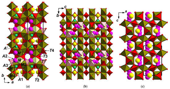 Large-cation sites are located in the channels of the pseudo-framework (Figure 4a–c). Almost fully occupied site A(1) [K0.47Na0.470.06] and low-occupied site A’ [☐0.94Ca0.03Na0.03] are located at the distance of 2.47 Å from one another and, thus, cannot be filled simultaneously. We do not also exclude that a minor amount of Ca could also be located in the A(1) site. The A(2) [☐0.75K0.25] and A(3) [K0.500.50] sites are located at a distance of 1.24 Å from one another and also cannot be filled simultaneously. These sites are also close to T’- and M’-centered polyhedra (both 25% filled), and, thus, the fragment with T’O4 tetrahedron and M’O6 octahedron and the fragment with A(2)/A(3) sites cannot be occupied jointly.
