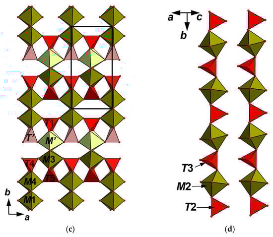 The structure of achyrophanite contains six crystallographically non-equivalent tetrahedrally coordinated sites T. Four of them [T(1,2,3,5)] are fully occupied by As5+. The T(4) site is filled by As with admixed lighter components; according to electron-microprobe data, there are S (prevailing), V, P, and Si (Table 1); it is refined as As0.68S0.32, assuming that “S” means all these admixtures together. The T’ site is predominantly vacant: ☐0.75As0.25. TO4 tetrahedra share with MO6 octahedra all vertices [T(2,3)] or two vertices and one edge [T(1,4,5) and T’] and, thus, “reinforce” the linkages in the octahedral pseudo-framework forming the heteropolyhedral pseudo-framework (Figure 5b). This pseudo-framework could also be described as a building unit formed by the (001) layers of octahedral dimers linked by common edges to the T(1,4,5)- and T’-centered tetrahedra (Figure 5c). Adjacent layers are linked with each other via the chains of alternating M(2)O6 octahedra and T(2,3)O4 tetrahedra (Figure 5d) sharing vertices with each other and with polyhedra of the layers.