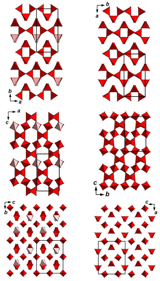 Figure 4. The crystal structures of achyrophanite (ac) and synthetic Fe3+AsO4 (df): drawn after [], both in three projections. The unit cells are outlined.