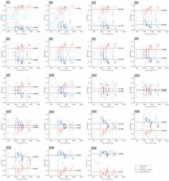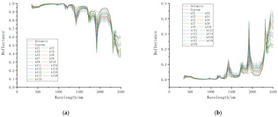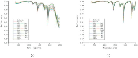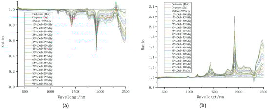 The reflectance spectra of the mixed minerals are treated using dolomite and gypsum spectra as divisors, respectively, to obtain the ratio spectra of the mixed minerals. Figure 6a takes the reflectance spectrum of dolomite as a divisor. It can be seen that the ratio spectrum of dolomite is a straight line (black line) with a constant value of 1. In contrast, the gypsum (red line) ratio spectrum is located at the bottom of the coordinate system. The ratio spectrum of other mixed mineral samples is distributed between two pure minerals, and the ratio spectrum value is less than 1. Only around 2314 nm is greater than 1. When the ratio derivative spectra were compared with the original spectra, it was found that the spectral characteristics of dolomite at 1430 nm and 1920 nm were eliminated after the spectral ratio calculation. Similarly, the spectral characteristics of gypsum are strengthened. When the reflectance spectrum of gypsum is used as a divisor, the ratio spectrum of the mineral is shown in Figure 6b. It can be seen from the figure that the ratio spectrum of gypsum at this time is a straight line with a constant value of 1 (red line), while the ratio spectrum of dolomite is the largest (black line). The ratio spectrum of other mixed mineral samples is also distributed between the pure minerals. The ratio spectral values of the mixed minerals are generally greater than 1, with only slight deviations from 1 near 2314 nm. The spectral characteristics of gypsum in the ratio spectrum are eliminated, and the spectral characteristics of dolomite are highlighted, especially in the 1430 and 1920 nm bands.