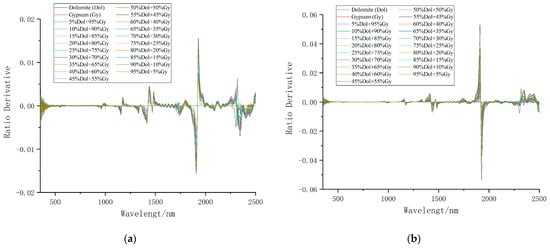 Ratio derivative spectra of mixed minerals. (a) Gypsum character retained; (b) Dolomite character retained.