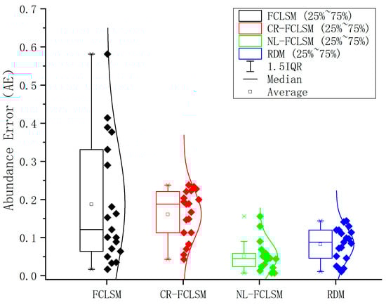 Adding FCLSM to the comparison is to find a more accurate method than the traditional linear spectral model, but one that is more general than the nonlinear regression model for unmixing mixed minerals. Figure 9 shows the error box plots of mixed mineral abundance under three linearization models. Among the three improved linearized spectral unmixing models, CR-FCLSM has the lowest unmixing accuracy, with an average abundance difference of 0.161, which is close to the 0.187 of FCLSM. It indicates that spectral envelope removal can improve the unmixing accuracy to a certain extent, but the effect is limited. The unmixing error of RDM is centered, with an average abundance difference of 0.082. The unmixing error of NL-FCLSM is the smallest, and the average abundance difference obtained by this model is only 0.051. There is also a significant difference between the three linearized models in the upper and lower abundance ranges. Among them, CR-FCLSM has the most significant limit of abundance difference, reaching 0.195, indicating that the data fluctuates wildly, but it is still better than FCLSM. NL-FCLSM has the lowest limit of abundance difference, only 0.02, which suggests that the abundance error is very concentrated.
