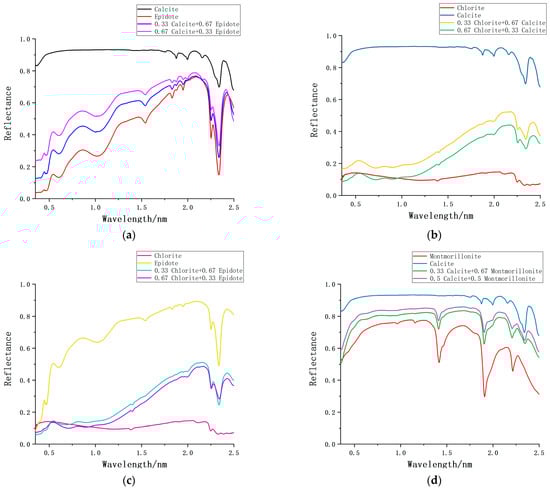 The reflectance spectra of typical mixed minerals in the USGS spectral library. (a) Calcite and Epidote; (b) Chlorite and Calcite; (c) Chlorite and Epidote; (d) Calcite and Montmorillonite.