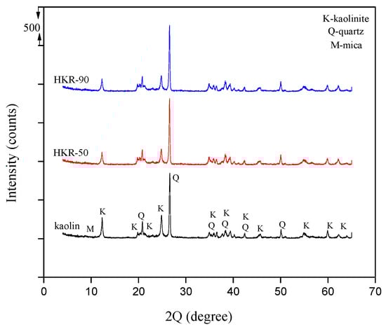 XRPD analysis was used to determine the crystalline phase composition and structural properties of kaolin and organokaolinites. Mineralogical analysis confirmed that kaolinite is the dominant mineral in kaolin, with smaller amounts of quartz and mica (Figure 3) [34,35]. The semiquantitative distribution of crystalline phases was estimated as clays ≥ 60% and quartz ≤ 40%. The values of the main basal reflection (d001) of kaolinite were 7.090 Å for kaolin, 7.191 Å for HKR-50, and 7.128 Å for HKR-90. These results indicate that modification with the cationic surfactant HDTMA did not significantly change the interlayer spacing of kaolinite, confirming that the surfactant is primarily located on the external surface of the clay mineral. The lack of substantial changes in XRPD patterns indicated that the surfactant remained on the kaolinite surface rather than penetrating the interlayer space. Although Xi et al. [42] used significantly higher amounts of HDTMA (200% and 400% CEC) for the modification of kaolin, they also observed no increase in the basal spacing (d001) for organokaolinites, which remained at 7.1 Å, the same as in unmodified kaolin. This further confirms that HDTMA was adsorbed exclusively on the kaolinite surface without intercalation into the crystal structure.