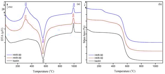 The DTA curve of kaolin contains three peaks. One endothermic broad peak of low intensity in the temperature region from 25 to 180 °C originates from dehydration. Then, a much sharper and more intense endothermic peak at 560 °C is related to the dehydroxylation whereby metakaolin was formed. The last peak in the DTA curve of kaolin is a sharp exothermic peak at 990 °C corresponding to metakaolin’s recrystallization [44]. All of the mentioned peaks are also present in the DTA curves of HKR-50 and HKR-90, except in the temperature range from 180 to 450 °C, where an exothermic peak at 312 °C for HKR-50 and 320 °C for HKR-90 was observed due to the oxidation of surfactant on the surface of kaolinite. With the increase in the amount of HDTMA in organokaolinite, a shift towards higher temperatures was observed, indicating that more energy is required for the oxidation of the organic phase in HKR-90 due to a higher amount of HDTMA on the kaolinite surface compared with HKR-50. The presence and shift of the aforementioned peaks towards higher temperatures, as well as the increase in mass loss in the temperature range from 180 to 450 °C, confirmed the presence of HDTMA in both organokaolinites.
