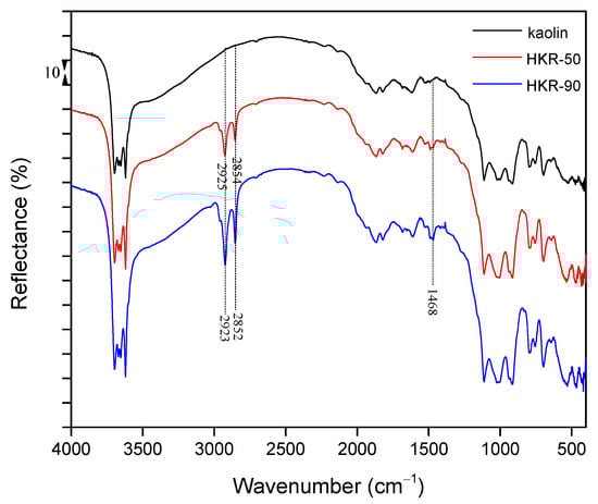 DRIFT spectroscopy offers a few advantages over other infrared techniques including simple sample preparation, greater numbers of substantial bands, and the ability to detect both major and minor components from the same spectra [46]. The DRIFT spectra of the starting kaolin and organokaolinites are given in Figure 5. The DRIFT technique has led to a better understanding of the outer layers and properties of materials [47,48]. Compared with the starting kaolin, the infrared spectra of HKR-50 and HKR-90 have all the characteristic peaks of the untreated kaolinite without any changes in their positions. The characteristic bands for hydroxyl stretching vibrations and adsorbed water stretching vibrations were located between 4000 and 3000 cm−1 [49]. Specifically, the stretching vibrations of the outer and inner hydroxyl groups of kaolinite were found between 3700 and 3600 cm−1 [25,49,50,51]. Absorption bands at 3690, 3669, 3652, and 3620 cm−1 are characteristic of kaolinite, and the presence of all four bands suggests good crystallinity [49,50,51]. The band at 3620 cm−1 corresponds to the stretching vibration of the inner hydroxyl group, while the remaining three correspond to the stretching vibrations of the outer hydroxyl groups [50]. The OH vibration band at 1615 cm−1 was present in all spectra of kaolin and organokaolinites and was associated with physically adsorbed water [22]. Characteristic vibrations bands of kaolinite Si-O (1114, 1027, 1004, 463, 426 cm−1), Al-OH (940, 913 and 690 cm−1) and Si-O-Al (793, 754 and 530 cm−1) appeared in the DRIFT spectrum of raw kaolin and in spectra of organokaolinites with the same intensity of bands [22,32,51]. The presence of additional absorption bands typical for HDTMA in the DRIFT spectra of both organokaolinites provided substantial proof of the successful modification of kaolinite with HDTMA ions. Bands between 3000 and 2800 cm−1 were considered the signature of -CH2 asymmetric and symmetric stretching vibrations of the alkyl chain, and the band at 1468 cm−1 is characteristic of the bending vibration of the CH2 group [32,52,53]. The position of stretching vibration bands is usually used for a better understanding of how surfactants were arranged on the surface of a mineral [54]. Namely, Kung and Hayes [55] noticed that at a lower surface coverage, adsorbed HDTMA molecules appeared more like monomers, with absorption bands at 2860 and 2930 cm−1. At a higher surface coverage, surfactant molecules had a micelle surface configuration, causing a shift of the vibration bands to lower frequencies (2853 and 2923 cm−1). Also, if the initial concentration of surfactant is below the CMC value, monomers exist in solution, so surfactant ions usually form monolayer at the mineral surface. When the initial surfactant concentration exceeds the CMC, as in this study, micelles exist in solution, so surfactant molecules will associate to form aggregates (e.g., admicelles) or a bilayer at the mineral surface [36,56]. In the DRIFT spectra of the organokaolinites (Figure 5), asymmetric and symmetric stretching bands of CH2 originating from HDTMA were clearly visible, and their intensities increased with the amount of surfactant. The organokaolinite with a lower HDTMA content (HKR-50) showed stretching bands at 2925 and 2854 cm−1. In contrast, the absorption bands of HKR-90 were shifted further to lower values, 2923 (asymmetric) and 2852 cm−1 (symmetric stretching), similar to those reported for micelle configurations [51]. The band positions for HKR-90 corresponded to the arrangement of the surfactant on the kaolinite surface as micelles, while the position of absorption bands for HKR-50 laid between the values reported by Kung and Hayes [55] for monomer and micelle configurations, which may suggest a local bilayer arrangement of the surfactant on the kaolinite surface.