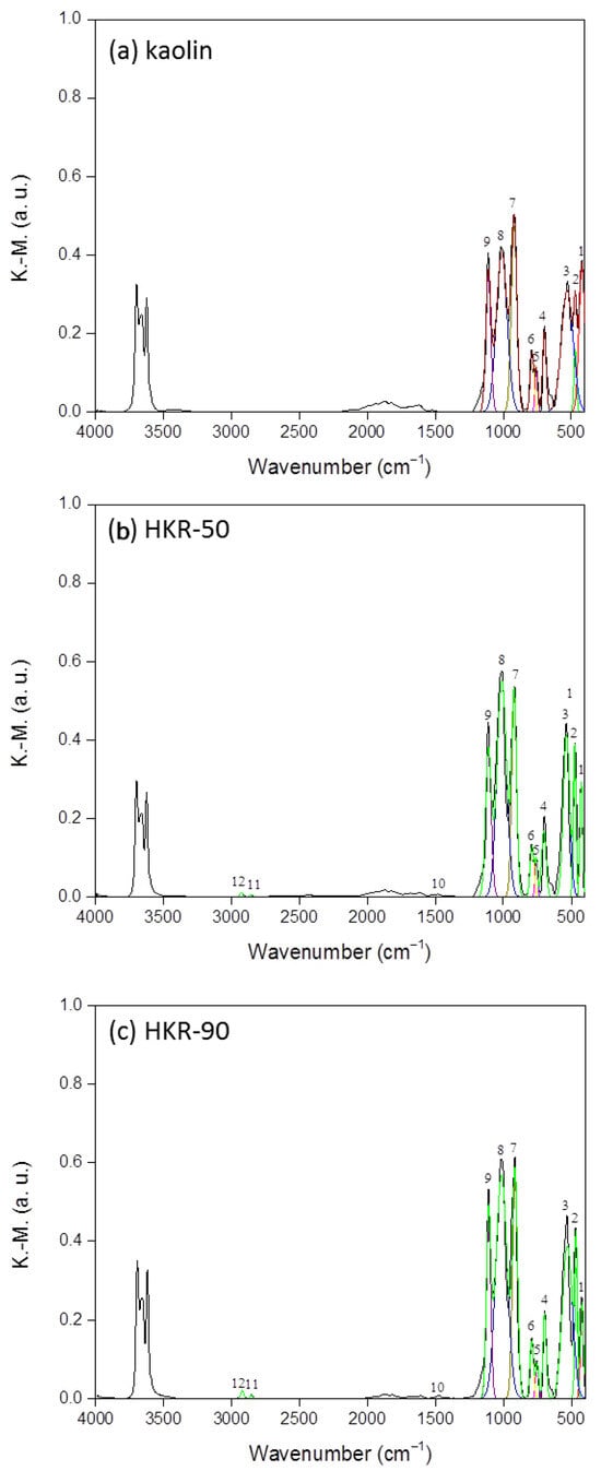 This was calculated as the ratio of the sum of the areas of the bands (A) corresponding to hydrophilic groups to the total areas of both hydrophilic and hydrophobic groups present in the samples. Higher values of the degree of hydrophilicity correspond to a less hydrophobic material and vice versa [47,58]. To calculate the areas of the bands which were used in Equation (2), a Gaussian function was utilized for the deconvolution and fitting of the normalised DRIFT spectra, as presented in Figure 6 by colored lines in all three spectra (the relative areas of each group and the absorption maxima (ṽ) are not presented in this research). The degree of hydrophilicity (%A) for the kaolin was 79.30%, while for HKR-50 and HKR-90, it was 78.42% and 73.93%, respectively. These results showed that hydrophobicity increased with increasing amounts of the surfactant on the kaolinite surface.
