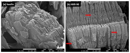 As a visual confirmation of the presence of the surfactant on the kaolinite surface after modification, SEM images of the initial kaolin and HKR-90 were recorded and are presented in Figure 7.