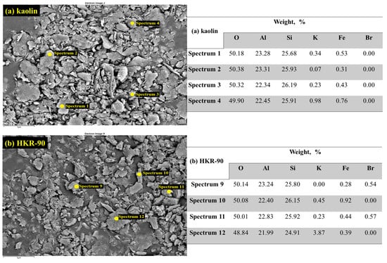 The initial material kaolin (a) consisted of a large amount of scaly kaolinites of different sizes and a smaller amount of layered mica and quartz with characteristic regular shapes, confirming the results of the XRPD analysis regarding the presence of these minerals. Also, for organokaolinite, all the previously mentioned minerals were observed. Still, changes were observed on the surface of the kaolinite in the form of group-distributed surfactants, uneven deposits that were formed based on the amount of surfactant used to modify the mineral. It can be observed that for HKR-50 (Figure S1), part of the kaolinite surface was not covered with HDTMA ions while a significant portion of the surface was modified, which corresponded to the amount of surfactant used in the preparation of this material. In the case of HKR-90, a large part of the kaolinite surface was covered with HDTMA ions (red arrow in Figure 7b), reflecting the highest amount of surfactant used in its synthesis. The results obtained in this way were another confirmation of the successful modification of the kaolinite surface. To provide a more comprehensive explanation of the results, an additional EDS analysis was conducted. Several points were selected during the experiment to identify all present minerals. The primary focus was on identifying kaolinite and examining changes in the elemental composition of kaolin before and after modification.