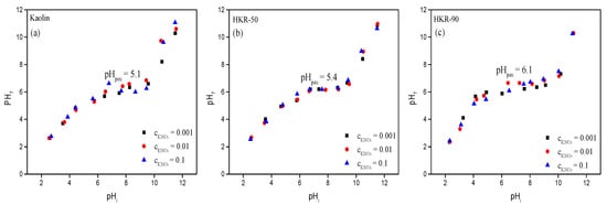 The pH is an important factor affecting different forms of ionizable organic compounds, such as OCHRA and ZEN, in solution. Also, the ionization of chemically active sites on an adsorbent surface can be different depending on the pH of a solution. In this study, pH-metric measurements were used to investigate how the surface charge of the adsorbent changed at different pH values. This was done by determining the point of zero charge (pHpzc). The pHpzc is defined as the pH at which the net surface charge of the adsorbent is zero, meaning that the number of positively and negatively charged sites is balanced [59]. The surface charge is positive at pH < pHpzc and negative at pH > pHpzc [60]. The kaolinite, as a 1:1 layer aluminosilicate, contained an octahedral sheet whose surface properties were pH-dependent due to the protonation and deprotonation of hydroxyl groups on broken edges and the sheet surface. In contrast, the tetrahedral sheet possessed a permanent negative charge, independent of pH [22,61]. When pH > pHpzc, the deprotonation of hydroxyl groups occurred (Al-OH + OH− →Al-O− and Si-OH + OH− → SiO−), while at pH < pHpzc, protonation occurred (Al-OH + H+→ Al-OH2+), leading to a more positively charged kaolin surface [22,61,62]. The results of the pHpzc determination for the kaolin and two organokaolinites as a function of the concentration of electrolytes are presented in Figure 9a–c.