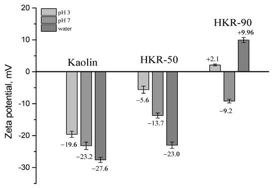 Zeta potential of kaolin and organokaolinite in water and at pH 3 and 7 [32].
