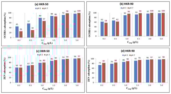 The adsorption of OCHRA and ZEN was carried out under conditions that resemble the gastrointestinal tract of animals, the stomach (pH 3) and intestines (pH 7). Preliminary results showed that less than 10% of OCHRA and ZEN were adsorbed onto the unmodified kaolin at pH 3 and pH 7 [35]. To improve the adsorption efficiency of kaolin for mycotoxins, the kaolin was modified with a new surfactant, HDTMA, aiming to obtain a safer material with enhanced properties. Characterization results revealed that the modification increased hydrophobicity and shifted the zeta potential to more positive values while preserving the intact layered structure of the kaolinite, as only the surface was modified with HDTMA. OCHRA is a hydrophobic molecule with carboxylic (pKa1 = 3.5) and phenolic (pKa2 = 7.0) functional groups. At pH 3, OCHRA predominantly exists in its neutral form, while at pH 7, it is fully in the anionic form. Similarly, ZEN is a hydrophobic molecule containing two phenolic hydroxyl groups, with a pKa1 value of 7.6. As a result, ZEN exists primarily in the neutral form at pH 3, and at pH 7, it remains mostly neutral, with approximately 80% in the neutral form and 20% in the anionic form [32]. The adsorption of OCHRA and ZEN versus different concentrations (0.3–5.0 g/L) of HKR-50 and HKR-90 in suspension at a constant initial mycotoxins concentration (2.0 mg/L) was followed in a buffer solution at pH 3 and 7, and the results are presented in Figure 11.