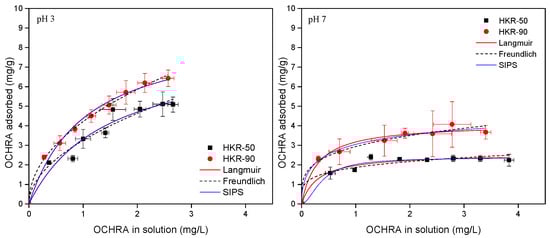 OCHRA adsorption by HKR-50 and HKR-90 at pH 3 and pH 7.