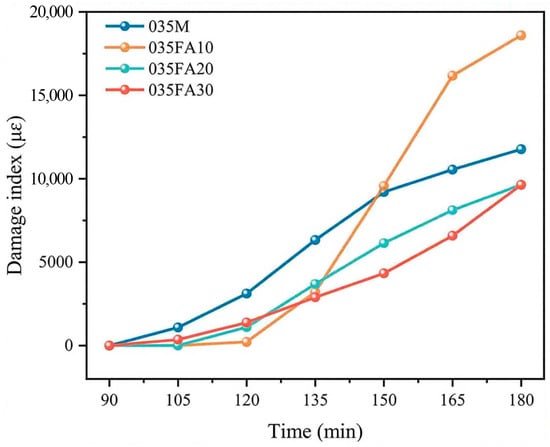 Fly ash is transported through flue gases and collected using electrostatic precipitators and filter bags during the combustion of pulverized coal in the boiler [24,25]. The chemical composition of fly ash is typically characterized by high contents of SiO2, Al2O3, and CaO, while its principal mineral phases include anhydrite and calcite. The contents of SiO2 and Al2O3 in fly ash are similar to those in clay, making it a viable substitute for clay in the calcination of cement clinker [26]. The residual carbon content in fly ash can also serve as an auxiliary fuel during calcination, thereby reducing overall energy consumption. Fly ash-based cement exhibits several advantages compared to clay-based cement, including reduced cracking tendency, lower drying shrinkage, lower heat of hydration, and enhanced sulfate resistance [27]. As the active mixed material in cementitious systems, fly ash reacts with the Ca(OH)2 generated during cement hydration to form hydration products such as Ca5Si6O16(OH)·4H2O gel and ettringite [28]. These products fill the pore structure of the matrix, promoting strength development and improving impermeability. As shown in Figure 2, incorporating more than 20% fly ash effectively reduces the risk of plastic shrinkage-induced cracking in cement mortar (hereinafter referred to as mortar) [29]. At water-to-binder ratios of 0.4, 0.5, and 0.6, the optimal Class F fly ash replacement levels are 32.5%, 35%, and 37.5%, respectively [30]. In terms of synergistic utilization, Geetika Mishra et al. [26] found that the optimal replacement rates for biochar and high-calcium fly ash (Class C) in cement are 5% and 10%, respectively. Accelerated carbonation of the mortar, as shown in Figure 3, significantly increased the elastic modulus at both 7 and 28 days and enabled the sequestration of up to 50% of ambient CO2 into the cement matrix. Therefore, aluminosilicate clay minerals can be replaced by fly ash in cement clinker production, with both product performance and energy efficiency being enhanced. Additionally, fly ash can be utilized as the active mixed material, resulting in improved strength, reduced cracking, and substantial carbon reduction benefits being delivered. Yet, questions remain regarding the long-term durability of these products under field exposure conditions, such as sulfate attack, freeze–thaw cycles, and carbonation.