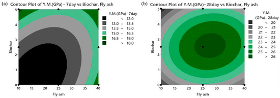 Contour plots of elastic modulus for cement composites incorporating carbonized biochar and fly ash at (a) 7 days and (b) 28 days [31].