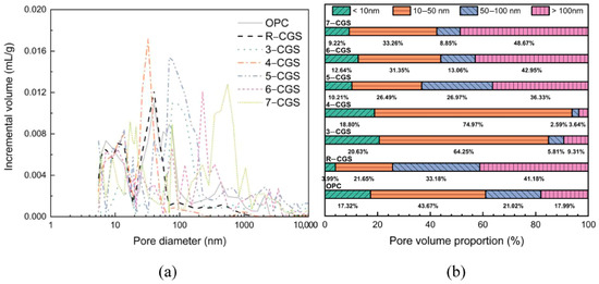 (a) Pore size distribution and (b) pore volume ratio of mortar [37].