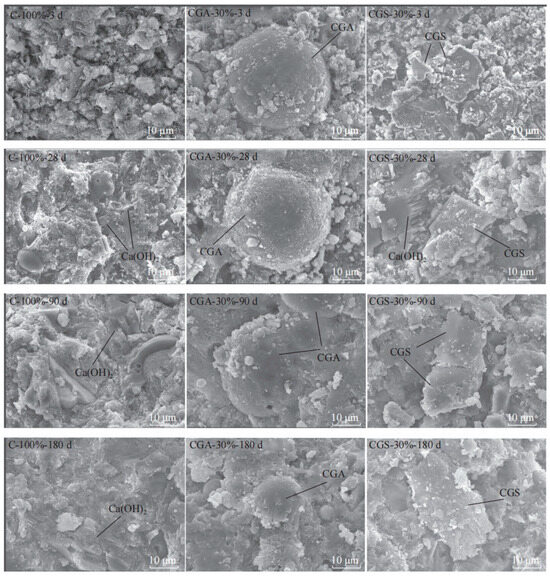 Microstructures of cement, coarse slag, and fine slag samples at different hydration times [39].