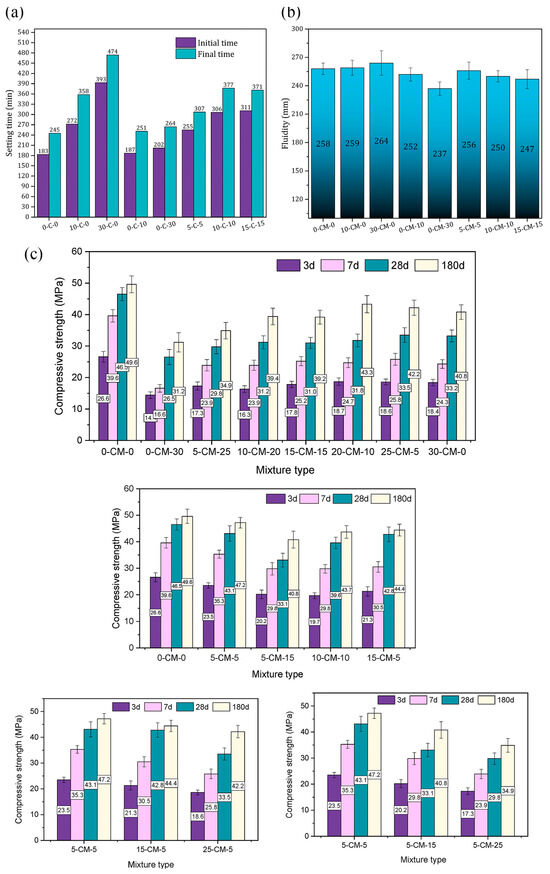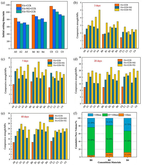 (a) Initial setting time of composite binders; (b) compressive strength at 3 days; (c) compressive strength at 7 days; (d) compressive strength at 28 days; (e) compressive strength at 60 days; (f) pore structure at 60 days [81].