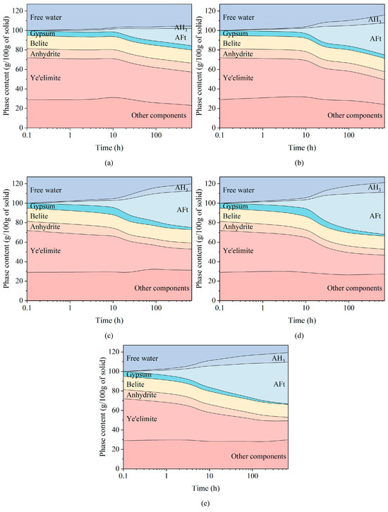 Hydration process of mortars cured at (a) 10 °C, (b) 5 °C, (c) 0 °C, (d) −5 °C, and (e) 20 °C [53].