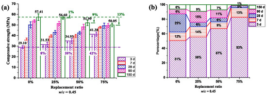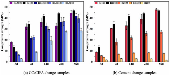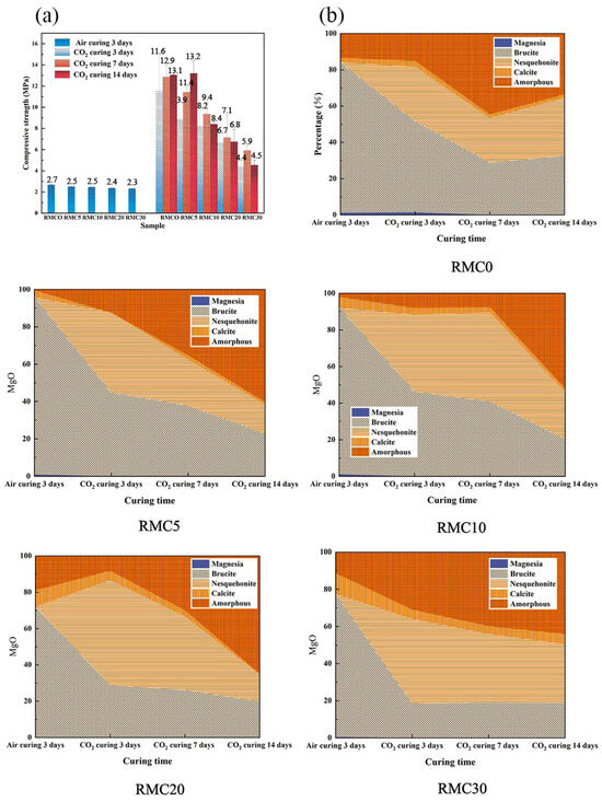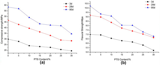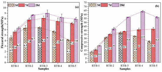Mechanical strength of red mud–titanium gypsum–blast furnace slag cementitious material: (a) flexural strength; (b) compressive strength [80].