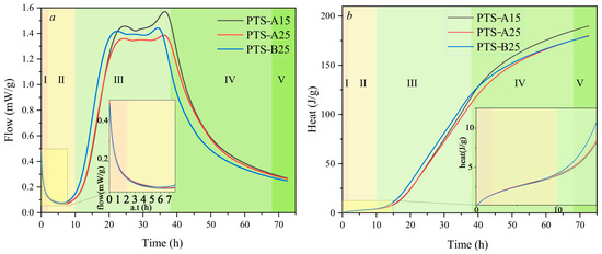 Hydration characteristics of phosphorus tailings–cement blended mortar: (a) heat evolution rate and (b) cumulative heat release over 70 h (initial hydration stage I, induction stage II, acceleration stage III, deceleration stage IV, and stable stage V) [62].