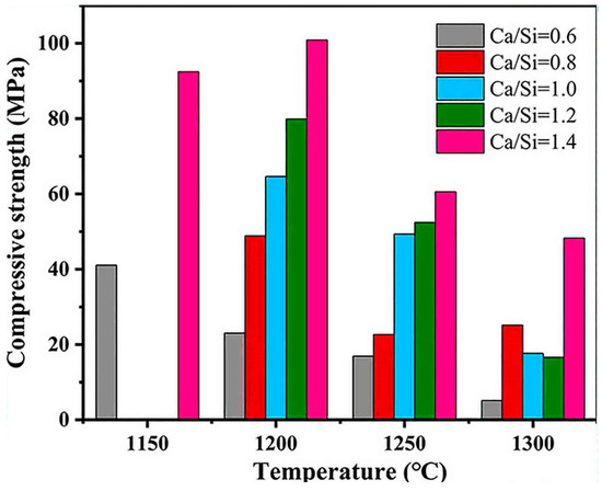 The chemical composition of copper tailings is mainly composed of SiO2, Al2O3, and Fe2O3, while the dominant mineral phases include andradite and dolomite [64]. Sandstone and clay can be replaced by copper tailings for the production of Portland cement. Heavy metals contained in the tailings can replace Ca2+ in Ca2SiO4 and Ca3SiO5, thereby increasing the reactivity of Ca2SiO4 and promoting its hydration, which ultimately enhances the long-term hydration strength of cement clinker [65]. Pei et al. [66] prepared a low-calcium Portland cement clinker using copper tailings as the siliceous raw material. The results showed that CaSiO3 was the dominant phase when the Ca/Si ratio was less than or equal to 1.0, whereas a composite Ca2SiO4-Ca3SiO5 system formed when the ratio ranged between 1.0 and 1.4. Moreover, the Ca3SiO5 content increased with the rising calcination temperature. As illustrated in Figure 16, the compressive strength of the carbonated sample exceeded 100 MPa at 1200 °C and a Ca/Si ratio of 1.4. Cheng et al. [67] used copper tailings at 20.31 wt% as cement raw meal and 15 wt% as the active mixed material to produce Portland cement that met the Chinese national standard for P·O42.5-grade cement. An annual economic benefit of USD 293.00 million and a reduction of 44,000 tons of CO2 emissions per year can be achieved. Both studies diverge in terms of the optimal incorporation ratio and performance indicators. Pei et al. focused on high-temperature strength development in synthetic clinker systems, whereas Cheng et al. validated industrial applicability at moderate replacement levels. Therefore, copper tailings can serve multiple functions in cement production, such as acting as a mineralizer or iron raw material, significantly contributing to reduced calcination energy consumption and enhanced late-stage strength. The utilization of tailings as the supplementary cementitious material enables higher incorporation levels, contributing to both environmental sustainability and economic efficiency. In addition, further efforts should be directed toward exploring the synergistic utilization of copper tailings with other industrial solid waste in cementitious systems.