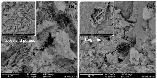 SEM images of mortar pre-cured at 80 °C for 28 days: (a) flocculent and reticular Ca5Si6O16(OH)·4H2O; (b) needle-lie hydration products in micropores [85].