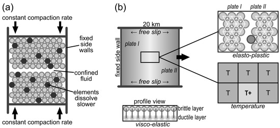 (a) Schematic setup for stylolite modeling. Two rocks represented by elastic elements that can dissolve are pressed together at an interface. The elements will then dissolve as a function of differences in stress, elastic and surface energy. The noise in the system is set by different dissolution constants of single elements, large grains (made up of multiple elements) and layers [8]. (b) Setup for MOR modeling where two plates are pulled apart from each other. Once a fracture opens, new hot elements are introduced to model accretion. Heat diffusion is calculated in a second grid and in pseudo-third dimension, the plate model is attached to a viscous “mantle” layer.