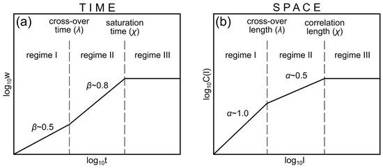 Figure 3 shows the scaling regimes that are typically found for stylolites, with two self-affine scaling regimes in space and time and the third regime where the width is constant. In time, the exponent is termed the growth exponent, and, in space, it is termed the roughness exponent. In stylolites the system goes through a switch between a surface energy dominated regime (I) with growth exponent of 0.5 and a roughness exponent of 1.0 to an elastic energy dominated regime (II) with a growth exponent of about 0.8 and a roughness exponent of 0.5 before reaching the correlation length (regime III) [2,3,4].