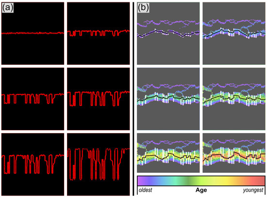 Comparison of (a) a stylolite simulation with a real stylolite in example 1. In this case, the stylolite simulation is initiated by background noise and larger grains that pin the interface in contrast to a layer, as in Figure 4a. Because the stylolites show dissolution, the interface is clearly visible as a dark line that collects insoluble material in the real case. And (b) a MOR simulation with a real ridge in example 2. It shows a MOR simulation that started at a fracture and that develops vertical KFs similar to the natural example on the right-hand side of the North Atlantic MOR. The interface is more complicated in the MOR simulation because it is a growth feature, with the color scale in the simulation indicating different ages of elements (from purple (old) to red (young)). In the real example, a height map illustrates the different ages with the young parts in yellow and the old parts in blue.