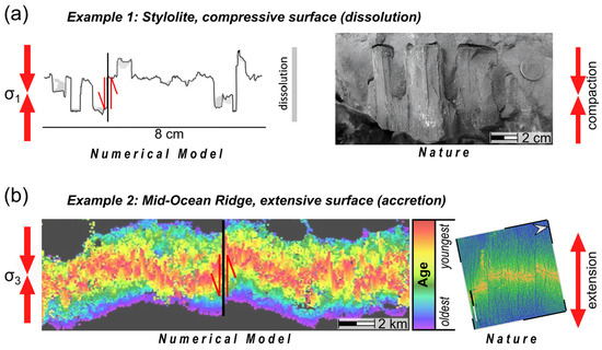 MORs and stylolites both develop faults and related offsets that are oriented perpendicular to their main roughening interface and are thus oriented parallel to one of the principal stress directions [3,17]. As such, these faults do not contain shear stresses, but are purely developing because of relative movements (Figure 7) or stresses rotate locally around the fault to produce shear stresses. Therefore, they can be understood as kinematic faults (KFs) rather than stress-induced faults, at least on a larger scale. Fault plane solutions show that local stresses around transform faults are producing strike-slip earthquakes, indicating that stresses rotate locally around the faults [33]. In terms of MORs, the transform faults are known to be KFs that are oriented parallel to small circles of plate reconstruction. However, in our model, they also develop without the rotation component and the curvature of Earth’s surface, only as a function of variations in accretion. In stylolites, KFs or the sides of stylolite teeth form due to differences in stress-induced dissolution. As such, they are three-dimensional columns and not straight surfaces like transform faults. Another difference between KFs in stylolites versus MORs is the fact that KFs in MORs merge into fracture zones that can be followed across the ocean floor, which is not the case for stylolites, where KFs are restricted to the dissolution interface. This difference develops because MORs are growth structures in contrast to the dissolving stylolites.