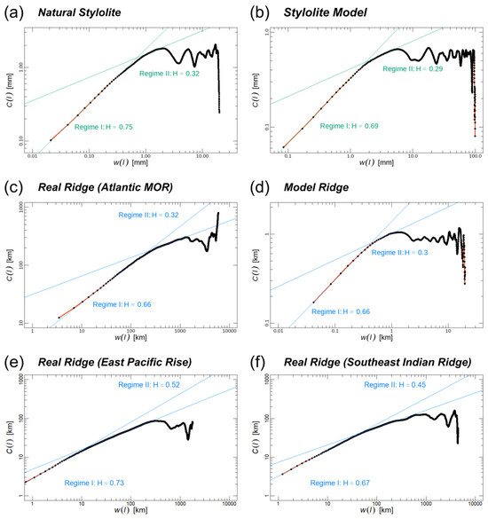 Correlation functions of (a) a natural stylolite (from the Kirchleus quarry in Northern Bavaria [4]), (b) a modeled stylolite (from Figure 5a [10]), (c) a natural MOR (southern part of the mid-Atlantic ridge), (d) a simulated MOR-KF system, (e) a natural MOR (East Pacific Rise) and (f) a natural MOR (Southwest Indian Ridge). Greenish colors in (a,b) are used for stylolites, bluish colors in (c–f) are used for MORs.